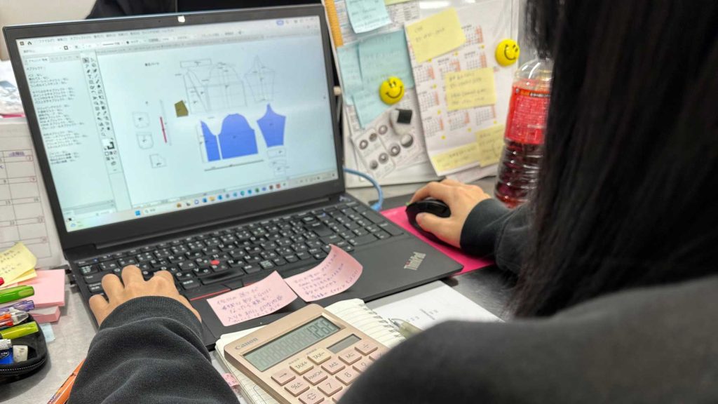 弊社はOEM業という立場上、パタンナーが全て自分でパターンメイキングする訳ではありません。ブランドやメーカーと縫製工場の間に入って、支給されたパターンの確認や縫製工程を理解し、より効率よく、より美しく縫製が出来るようにチェックをする、という業務もあります。