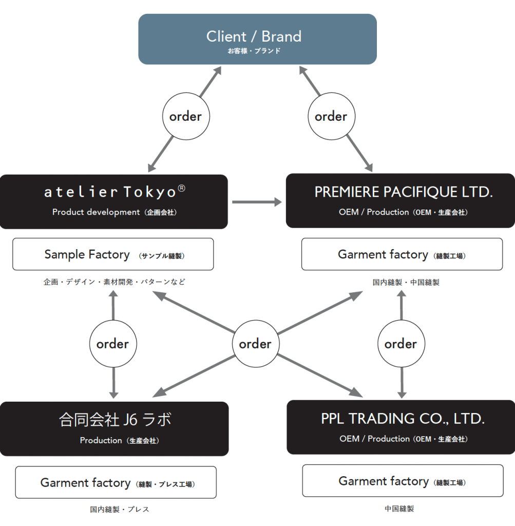 当社では国内外に生産背景を持っており、豊富な実績と高い技術力を持つ縫製工場と複数提携しています。国内では千葉県、大阪府、愛媛県、広島県に、国外では中国の大連、青島、上海に協力工場があり、ご依頼いただいたブランドや内容により、担当工場を振り分けています。